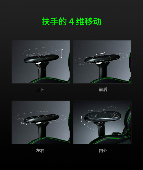 相比行业普遍采用的滑动式、上下升降(2D)、上下+前后移动(3D)扶手,雷蛇风神电竞椅的4D扶手采用了行业最高标准,能够上下移动、前后移动并能够左右和内外移动,适应各种坐姿的不同需求。如果你亲身体验这款4D扶手,拨动调节阀时清脆的金属弹动音一定会让你觉得质感一流。