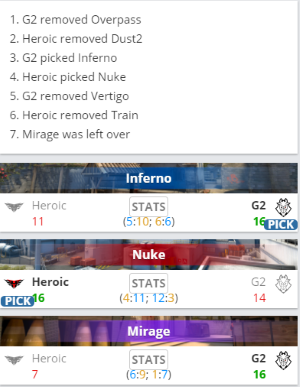 G2 2-1 Heroic(Inferno 16-11;Nuke 14-16;Mirage 16-7)