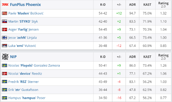 REZ三杀图二Inferno,NiP先选择防守方。4-0的领先下NiP手握场上主动,然而次局枪械优势的情况下NiP防守决策失误,A、B两点同时前压,却被FPX抓住空档击杀多人,B区下包后完成手枪翻盘。随后FPX打出自己的进攻节奏反超比分,NiP失去局势掌控,半场 6-9落后。下半场拿下手枪局后进攻方NiP扳平比分,场上局势再度胶着,NiP无法压制FPX的防守,FPX也无法轻松处理NiP的爆弹战术,比赛进入加时。加时赛中NiP略胜一筹19-17取胜。