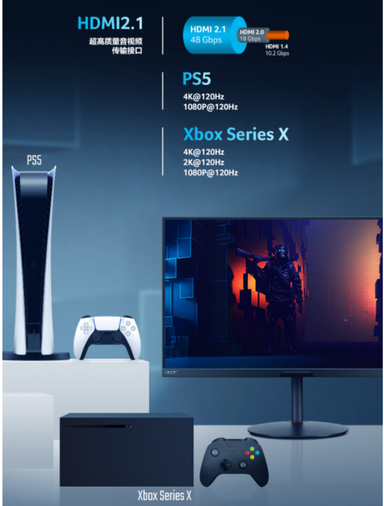 XV282K拥有4K超高清画质和原生144Hz疾速刷新的配置,这对于数据传输的速度和精准性都有着非常高的要求。在之前的4K 144Hz电竞显示器中,由于DP1.4接口的造价及技术壁垒较高,部分显示器采用双DP1.2的方式来缓解传输压力替代DP1.4,但在实际的使用中,DP1.2的局限性使其与很多游戏及软件无法兼容。XV282K采用的DP1.4接口适配性更强,搭载DSC显示流压缩技术,不同于传统422、420传输通过减少色彩信息来压缩所需带宽,DSC技术采用类似“打包压缩+解压”的传输方式,通过一个DP1.4接口就可以在高速传输的同时实现视觉无损。此外,XV282K更是配备了两个HDMI2.1接口、一个Type-c(65w)接口,顺应未来科技趋势,提升PS5、Xbox等主机游戏的体验,承载更多的电子设备。