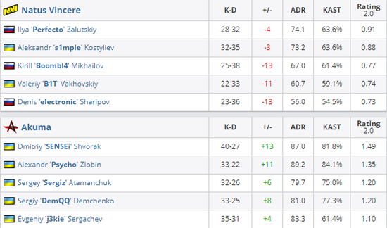 昨日另一场比赛是NaVi对阵Akuma,NaVi的第一张地图的表现已经不是一两个人掉线这么简单了。s1mple图一惨淡的5-16的数据是整支NaVi图一表现的缩影,仅仅27.8%的KAST可以称s1mple为本图的“局外人”了。另一边的Akuma的进攻十分流畅,在DemQQ和SENSEi的精彩表现下他们16-2赢下图一。