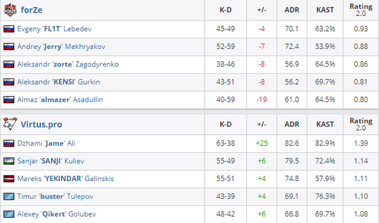 昨日EPIC League CIS的淘汰赛第一场对战双方分别是3-0出线的forZe和大战5场出线的Virtus.pro,图一Dust2上Jame用自己的大狙击溃了forZe,双方狙击手的差距在这张比较依靠狙击手发挥的地图上展现得淋漓尽致。不过forZe来到图二成功找回场子,半场5-10落后依旧是Jame带领队伍慢慢追分,不过给到他们的容错率还是没有那么多,在FL1T和KENSI也在状态的情况下forZe还是把握住机会成功扳回一城。