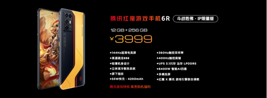 此外,官方此次还为玩家准备了腾讯红魔游戏手机6R斗战胜佛限量版。据悉其设计灵感来源于经典的孙悟空斗战胜佛形象,标志性的红黄配色和硬朗的机身线条速度感十足,让人感受到澎湃战斗力的同时,又会回忆起儿时的童真与热血。据悉,腾讯红魔游戏手机6R斗战胜佛限量版的售价仅为3999元,非常值得关注。