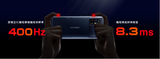 与此同时,为了能在144Hz帧率游戏中提供出色的操控流畅度和准确性,腾讯红魔游戏手机6R不只具备高达360Hz的屏幕多指触控采样率,其双独立IC肩键的触控采样率更达到了400Hz,触控响应时间仅8.3ms。这就意味其如今的触控肩键设计,不仅比其他机型上的物理肩键反应速度足足快了50%,而且长时间使用也更不易疲劳。并且配合新的“一键双雕”功能,按压一次肩键即可触发两个技能,也能为玩家在高帧率手游中提供更加显著的竞技优势,助力玩家“六指超神”。