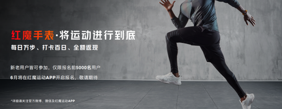 同时,红魔方面更将在6月开启“将运动进行到底”的活动。用户只需要在6月初于红魔APP上报名,此后坚持打卡100日,每日运动10000步。前5000名红魔手表用户便可得到全额返现,且新老用户均可参与。