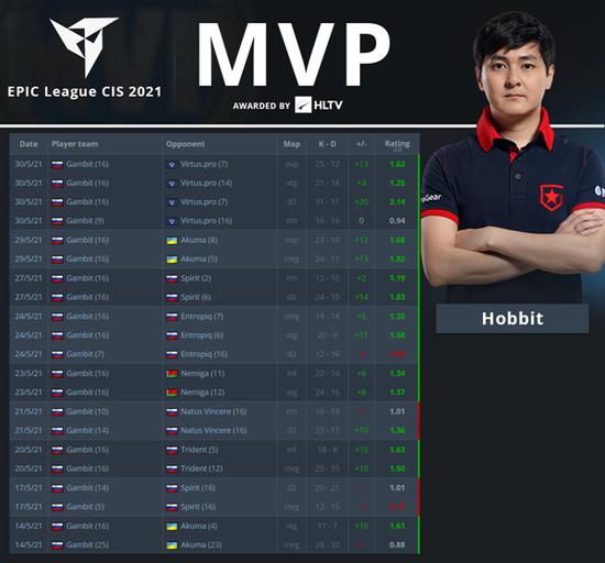 Gambit队中自由人Hobbit获得了HLTV评选的EPIC League CIS 2021赛事MVP。