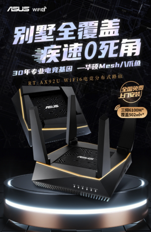 如果你追求游戏中的快感,一定要关注华硕RT-AX92U路由,这是一款三频路由器,在2.4G频段的速率为400Mbps,5G AC频段速率为866Mbps,5G AX频段速率为4804Mbps,并发速率之和高达6100Mbps。搭载4根高增益外置可折叠天线,系统设置简易,操控方便,组网也超级简单,通过APP只需设置一次,即可同步至AiMesh系统中的各个路由。这款路由器(两台装)活动价只需2799元,支持24期限免息,付尾款前10名送TUF背包,前11-50名送ROG抱枕。