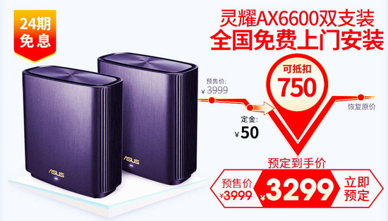 ROG GT-AX11000路由器是全球首款三频八天线万兆WiFi6电竞路由,峰值总吞吐量接近11000Mbps,它采用博通六十四位四核高性能处理器,并配有2.5Gbps端口,支持链路聚合疾速传输。支持Game First、Game Boost、WT-Fast三级游戏加速引擎,能够优先传输与转发网络游戏流量和数据包,确保玩家们获得流畅、无延迟的游戏体验。机身设有Boost Key一键游戏加速按钮,可快速开启或关闭Game Boost模式,并可自定义一键开启DFS频道,瞬间提升游戏效能。此外还可自定义AURA RGB幻彩灯效,战力觉醒。这款路由器原价3999,定金50可抵1050,预售价只需2999元,支持24期限免息,前5名送ROG手表,前6-50名付定金并支付者送ROG雨伞,前51-100名付定金并支付者送ROG抱枕。
