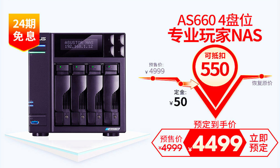 华硕AS6604T最大可扩容到288TB,采用英特尔J4125 四核CPU,HD600集成显卡,DDR4的4GB双通道内存和双M.2 SSD插槽的使用也让它活力满满,整体性能比固态硬盘好很多。还配备有LCD显示屏,整体做工和配置属于旗舰水平,原价4999元,定金50可抵扣550,最终只需要4499便可入手,晒单还送双肩包,好机会不要错过。