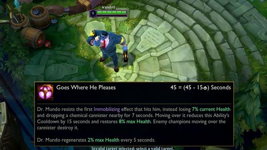 【蒙多被动】免疫第一个击中蒙多的控制效果,失去7%的当前生命值,并在附近掉落一个化学罐(7秒)。移动到化学罐则减少被动15秒冷却时间,并回复8%最大生命值。敌方英雄移动到化学罐上可将其摧毁。蒙多每5秒恢复2%最大生命值。