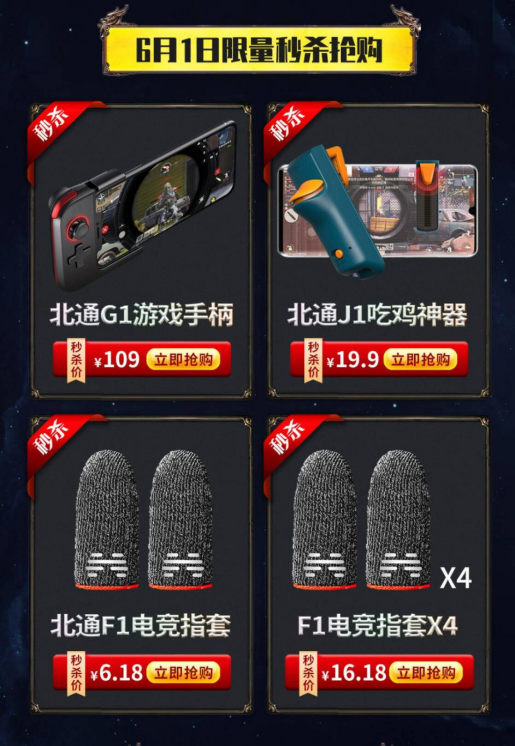 此外叠加优惠的每满200-30元、全场九折和白条3期免息都是除特价商品外的所有商品可以参与的优惠活动,比如大热的北通阿修罗3、北通宙斯精英手柄等产品也可以参加;还有北通G1手柄、J1吃鸡神器和F1电竞指套等热门产品限时秒杀,这次618开门红的优惠力度的确强大,“同价618”的口号可见一斑。