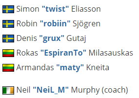 离开GORILLAZ的EspiranTo和离开NiP的twist在教练NeiL_M的撮合下重新回归,一支由3个瑞典人和2个立陶宛人组成的队伍正式成立。