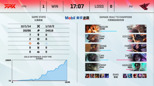 第一局双方前期平稳发育,8分钟爆发激烈战斗。FPX纳尔上路打出1换2,同时下路开花击杀RW下路双人组。随后纳尔不断扩大优势,滚大经济。13分钟经济已经领先7K,后续FPX下路成功包夹击杀敌方三人,成功拿下火龙。17分钟RW已无力阻挡FPX进攻,先锋一路撞到门牙塔,FPX拿下首局。