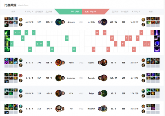 第一局,Liquid放给了EG蜘蛛,自己选择了三号位龙骑大哥斧王和跳跳的影魔,EG选择了小松鼠莱恩的双酱油。液体对线期小优,但三核都需要发育,EG趁机追回经济差。随后液体三核继续刷钱,三核都很穷,EG阵容强势期三大哥冲脸打出经济优势后结束比赛。