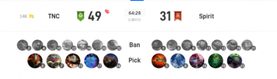 第二局,TeamSpirit在自己的出线生死战中自信选出卡尔,TNC选出大哥龙骑中单火女。中期无解肥拍拍肉山团抢到盾,一波带队扩大优势,劣势方火女虽然经济第三但生存环境和输出环境都很差,剧毒也是只有酱油的作用。Spirit持续进攻扩大经济优势,最后一波结束游戏,给自己晋级淘汰赛获得了更大的一份希望,也让TNC失去了进入胜者组的机会。