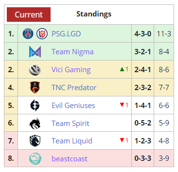 基辅Major为期4天的小组赛已经全部结束,最后状态正盛的LGD和从外卡赛找回状态的Nigma挺进胜者组。TeamSpirit在加赛中翻盘战胜Liquid获得了最后一个晋级淘汰赛的名额。欧洲区第二名Liquid和南美区第二名BeastCoast分别位列小组第七第八被淘汰。以下是小组赛最后一天战报: