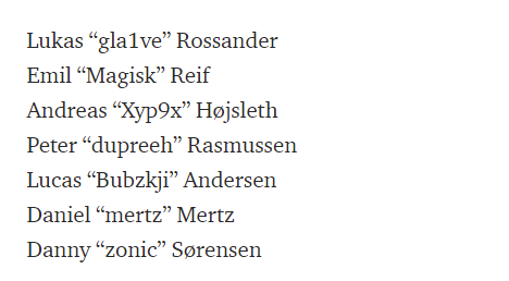 该爆料没有指明mertz加入之后是否会替换现在的某位首发选手,但也不排除Astralis保持六人阵容的可能。在device离队之后,Astralis在Flashpoint3的赛事中仅仅取得了第六名,在IEM Summer的赛事中也未能进入淘汰赛,或许正因如此他们才有意愿招入一名专职狙击手。一旦这笔签约成功,那么Astralis的阵容将会是: