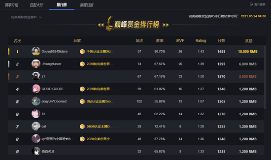 巅峰赏金赛#5头名易主,Sideny凭借57场80%的胜率豪取单人1W奖金。与此同时,巅峰排行榜上也有一批高手杀出重围,展现了顶尖玩家毫厘之间的处处博弈,一番战罢好不痛快。随着完美平台的高手玩家越来越多,为了让新鲜血液有机会加入角逐,巅峰赏金赛#6将按照6月17日24:00天梯排名前1500名发放比赛资格,同时不再保留上届资格,想要步入高手殿堂就趁现在抓紧冲分吧!