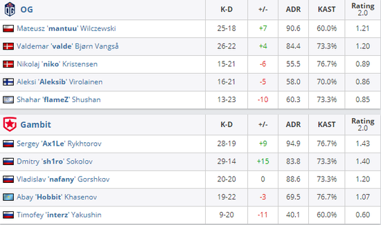 OG 0-3 Gambit(Mirage 14-16;Dust2 11-16;Overpass 7-16)