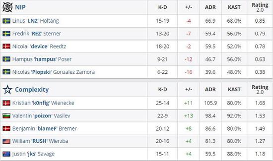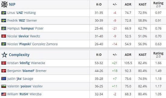 BLAST Premier 2021春季决赛,在今日的第二场比赛中,Complexity以2-0的比分成功战胜NIP战队,NIP暂时状态低迷全队无一人KD为正,反观Complexity这边,k0nfig与blameF依旧是状态火热,他们二人分别取得两图1.66与1.49的rating带领队伍成功赢下比赛取得首胜。