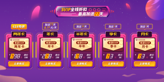 2021年6月18日-6月20日,业内最好用的电竞级网络加速器——奇游加速器618活动正式开启,此次活动属于“史低”优惠,所有时长参与折扣,不仅价格超低还加送时长卡,此外还追加了两年卡的抢购资格,最高立减198元: