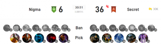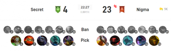 27分钟双方团战,Nigma龙骑跳刀先手小强,随后Nigma三核黑皇齐开击杀小强,得手后继续追击,Secret拉扯着阵型等Nigma黑皇时间一过,紫猫伐木机两个法核同时反打释放技能,电魂凤凰两人直接融化,龙骑毒狗再被追死。Secret又是打出一波零换四,随后推掉中路二塔,再推中路高地,随后再推中四塔,一路推掉了基地。