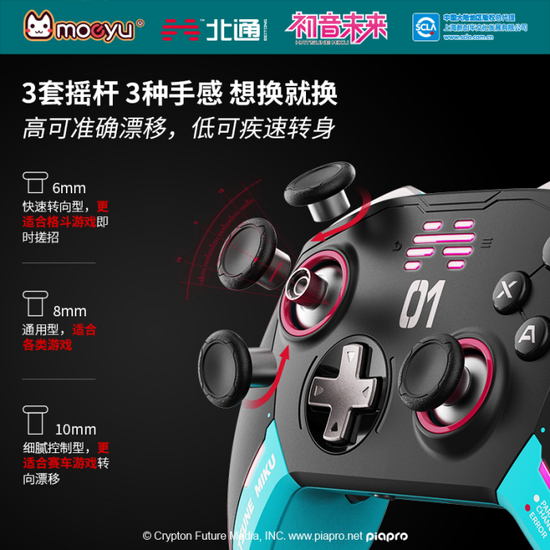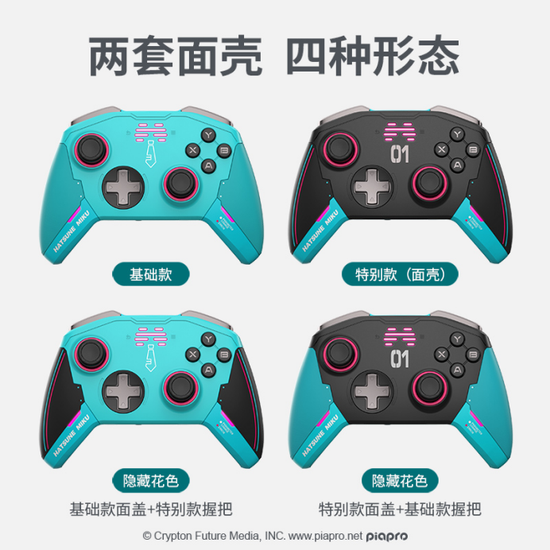 据官方透露,此次北通宙斯游戏手柄与初音未来的联动共有两种面壳共四种手柄形态,可供玩家自由切换。