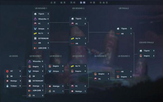 43分钟,Empire准备突袭拉席克但无奈输出不足,Spirit反手开团将伐木机与树精卫士击杀。Spirit立即推进攻破了Empire的下路高地,Empire在挣扎了一会儿后放弃了抵抗。