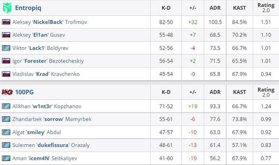 Kazakhstan peek来到自己的选图Nuke后Entropiq明显显得更加得心应手,率先作为防守方的他们成功取得10-5的半场领先,在这其中NickelBack功不可没,他在半场砍下22-6的KD与145的ADR。攻防转换后Entropiq依旧保持着十足的势头,100PG在挣扎了一段时间之后败下阵来,Entropiq以16-10扳回一图,本张地图的关键先生NickelBack豪取2.03rating傲视群雄。