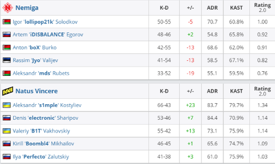 图一是Nemiga选择的Inferno,先做防守的NaVi迅速进入状态,再加上“双爹”手感火热,帮助队伍全程保持领先,最终16-7轻松取胜,图一最后“双爹”rating均超过1.50。来到图二Dust2,Nemiga开始发力,上半场与NaVi打个平手,来到下半场进攻方,lollipop21k独挑大梁,Nemiga在他的带领下成功压制有些哑火的CT边NaVi,以16-12扳回一图,lollipop21k斩获1.74rating。