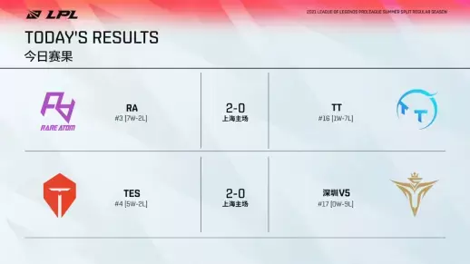 北京时间7月8日英雄联盟LPL夏季赛对局,RA以2比0战胜TT,拿到队伍的第七场胜利,TES则是2比0击败V5收获了自己的四连胜,跃居战队积分排行榜第四名。
