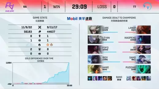 第一局:开局Xiaopeng雷克塞天胡开局,上下路分别击杀对面。8分钟TT拿下先锋。16分钟TT上野越塔击杀Cube,但不幸雷克塞的大人头被敌方拿下。21分钟RA抓住时机果断偷掉大龙获得巨大优势。27分钟RA再次趁TT众人抓青钢影又大掉大龙,并且TT想要开团,但被RA顺势团灭直接一波结束比赛。