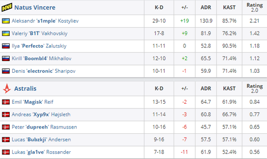 来到NaVi选择的Dust2,两队开局就进入胶着模式,互相打出连续得分节奏,一边是dupreeh大狙和Magisk的正面一边是s1mple和Perfect的突破,最终两边半场7-8结束。来到下半场双方依旧维持如此局面,一波进攻决策的失误就可能造成整回合的落败。两边的明星选手都有精彩发挥,先有s1mple大狙拿首杀赢残局,后有魔法男孩扫射转移追平比分,两边就这样一路打到加时赛。加时赛中Astralis顶住了最后一波成功将大比分扳平。
