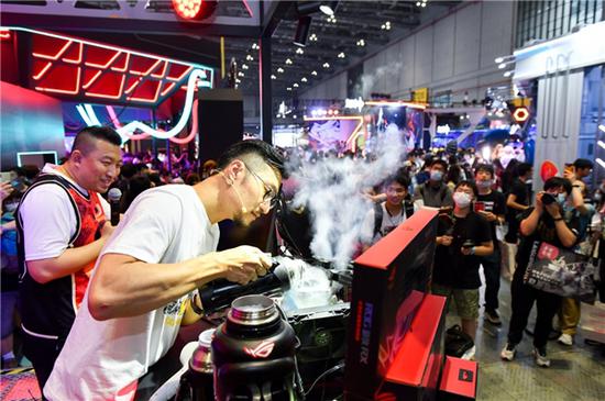 ROG信仰星球超频体验区配有一块超频猛兽ROG MAXIMUS XIII APEX主板(ROG M13A),供观众体验液氮超频的乐趣。10日下午Tony大叔携手B站百大UP主远古时代装机猿还在现场冲击超频记录,将ROG M13A主板和i9-11900K的性能发挥到淋漓尽致。酷爱水冷的阿肯老师9日上午莅临现场,以ROG x宜家的洞洞板为基础,用ROG M13H(ROG MAXIMUS XIII HERO)主板演示壁挂式水冷装机,吸引了众多玩家和媒体朋友争相观看。