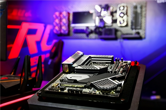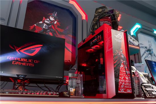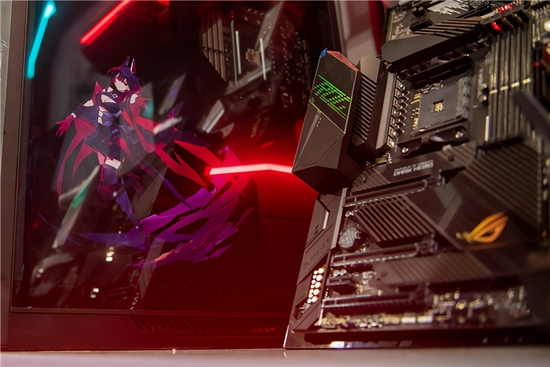 其中,黑红RO姬全家桶正面、侧面及背面都加入了大量ROG虚拟代言人Se7en的形象,辅以ROG信仰图腾,整体格外霸气外露。而此主板正是基于旁边静展的ROG C8DH主板为核心打造的。该主板采用16供电模组(90A),加上全覆盖式散热装甲,可迅速降低温度,且板载芯片区风扇的设计令其更安静,暗黑隐谧一如其名!特别是独家Dynamic OC Switcher混合双模(多/全核)超频黑科技,可释放处理器惊人性能,是名副其实的发烧级利器!