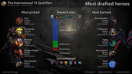 比以上几位难求一胜的英雄,还有10位英雄更加悲惨。祸乱之源、影魔、戴泽、赏金猎人、裂魂人、沉默术士、修补匠、哈斯卡全能骑士和食人魔魔法师即没有人选择它们上场,也没人把它们请上ban位。无人问津比起一胜难求更显凄惨。(破晓辰星没有进入队长模式不计入统计)