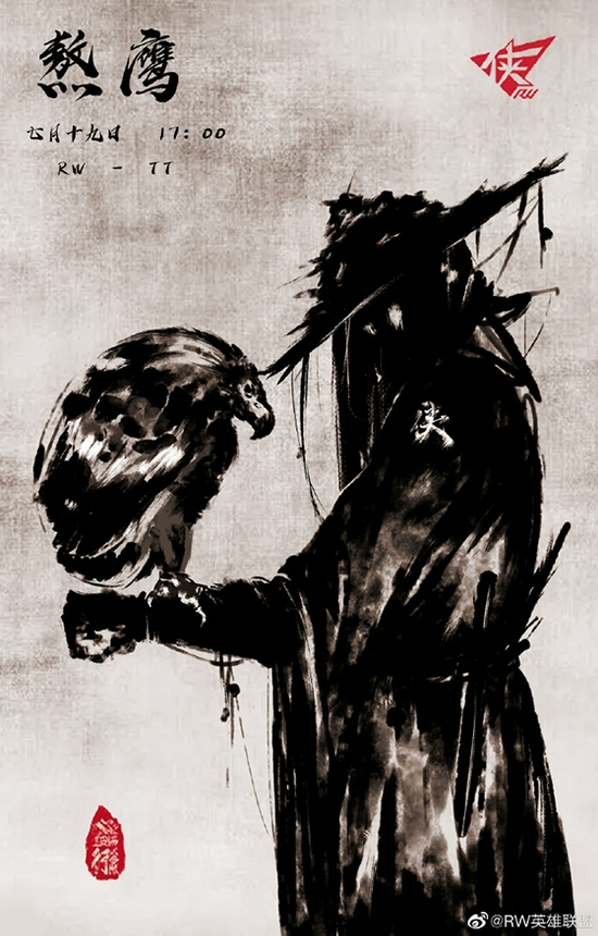 RW的海报标题是“熬鹰”,“熬鹰”一词为北京方言,本意指训练猎鹰的方式之一,通过让鹰一直熬夜使它困乏,从而达到驯服的目的(我国法律规定熬鹰是违法行为)。本赛季的RW延续了今年春季赛时掀翻TES的“奇迹buff”,继战胜iG后近期连斩SN和RA,这波2连胜的含金量“雀氏高”,不知今天TT能否挡住RW的连胜脚步。