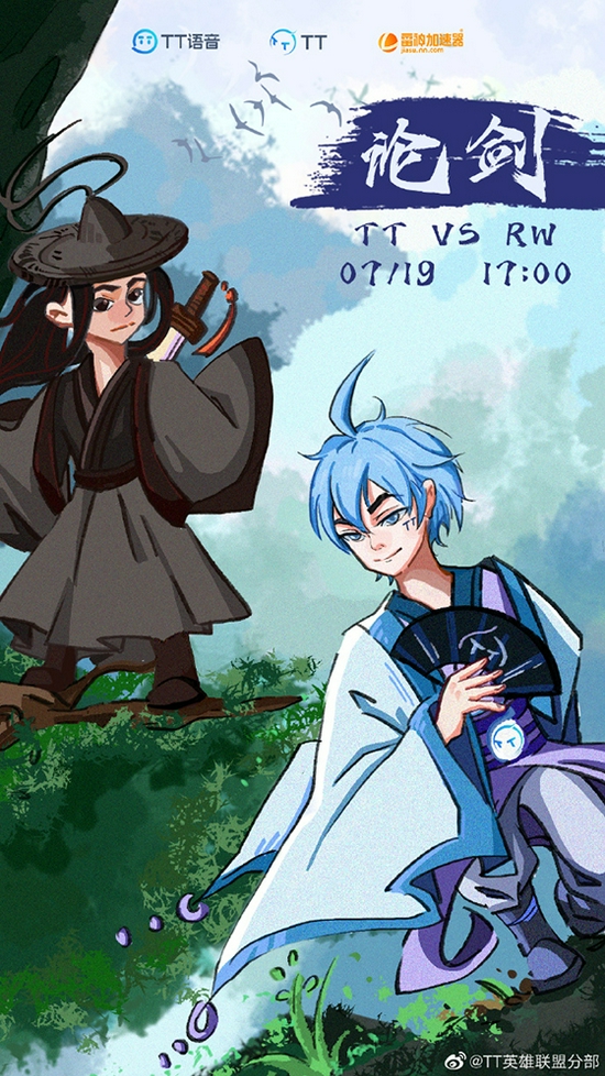 TT的海报标题为“论剑”,TT蓝发少年身着古风长袍,和立于树梢上的侠客RW准备来一场“剑术切磋”。除了排名倒数第一的十连败战队V5之外,苦吞5连败的TT惨淡沦为目前连败场次最多的队伍,虽然已经基本无缘季后赛,但TT仍然应该为拿到第二胜而全力以赴,期待RW的小将上野组合和TT老将上野Langx、Xiaopeng的正面对决!