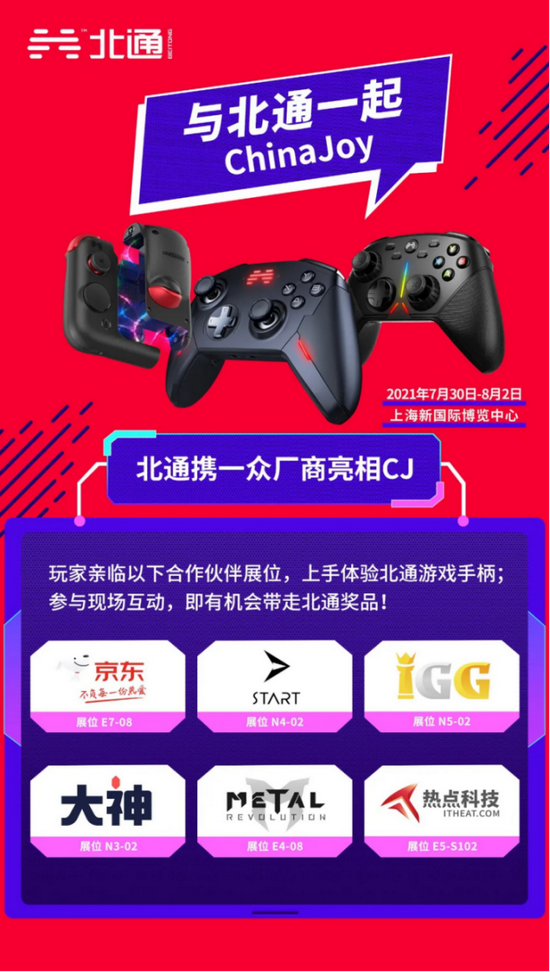 7月30日-8月2日,北通将在上海新国际博览中心ChinaJoy英特尔主题馆京东展区E7-08备上最热门的中国游戏手柄佳作,玩家除了可以近距离欣赏北通旗下的众多人气游戏手柄,届时北通展位也将举办丰富的游戏福利活动,玩家参与现场互动即送北通限量版周边、现场试玩即有机会抽北通宙斯精英游戏手柄!想要免费领大奖的玩家切不可错过!