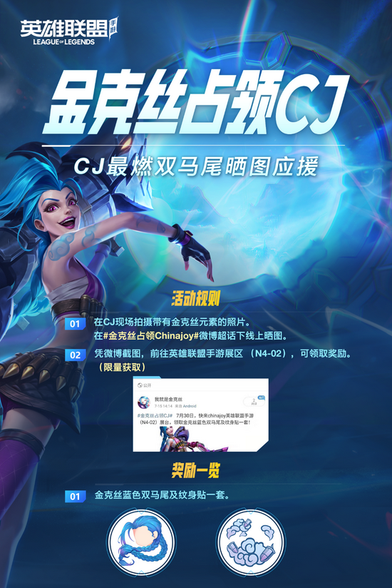 最燃双马尾晒图应援:在CJ现场拍摄带有金克丝元素的图片,在#金克丝占领CJ#微博超话晒图,凭截图前往英雄联盟手游展区(N4-02)领取奖励