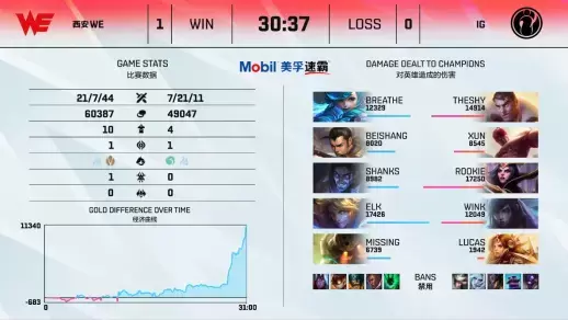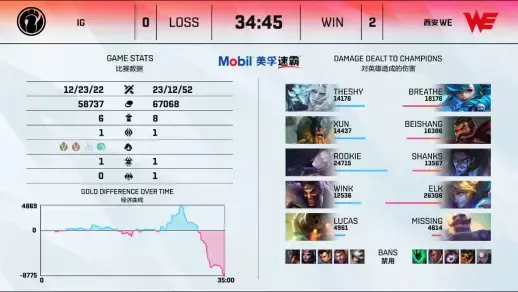 第二局:开局WE入侵红区,双方8人在F6打得有来有回,最终两边辅助互换,同时上路血拼WE格温丝血单杀破败之王。14分钟峡谷先锋团WE顺利收获先锋并击杀泰坦。23分钟EZ被泰坦大起,IG抓住机会击杀下路双人组,IG顺利拿到土龙魂。29分钟WE抓住机会击杀破败之王,IG战场分割被逐个击破仅剩发条,WE顺利收下远古龙和大龙。33分钟,IG四人被WE牵扯在下路,WE直接将兵线带至门牙塔并击杀德莱文,IG虽然尽力回防防守但无济于事,WE直点水晶结束本场比赛。