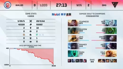 第一局:5分钟OMG杰斯TP上线,单杀LGD格温收获一血。中期OMG经过运营将LGD外塔攻破。27分钟OMG成功拿到听牌龙,并后续卡住红区视野,快速打掉大龙。随后远古龙团,OMG赵信冲散LGD阵容并逐个击破,打出2换5,顺势一波结束比赛。