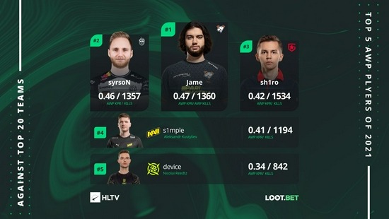 早些时候,Jame成为了HLTV 2021上半年的最佳狙击手,领先于sh1ro和s1mple。这位俄罗斯人在闪光弹利用率榜单上也有一席之地,他每回合平均能致盲0.92个人。