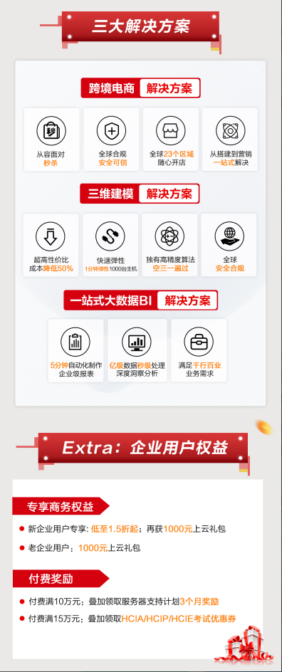 除了上述多款产品,活动期间还有多款解决方案迎来不同程度的优惠。对于从事跨境电商企业而言,华为云的跨境电商解决方案联合伙伴打造了包含平台建设、品牌塑造和效果营销在内的一站式解决方案,助力跨境电商企业出海,实现全球拓展;华为云的三维建模解决方案具备极高的性价比,无需初始投资及硬件运维,综合成本可降低50%,其快速弹性、空三一遍过、安全合规等特性,更是解决了企业的后顾之忧;而华为云一站式大数据BI解决方案作为企业级报表平台,5分钟可完成自动化报表制作,其亿级数据秒级处理,可深度分析企业运营数据,提升企业效率。值得一提的是,华为云部分解决方案将迎来年度低价,价格将会再爆惊喜。