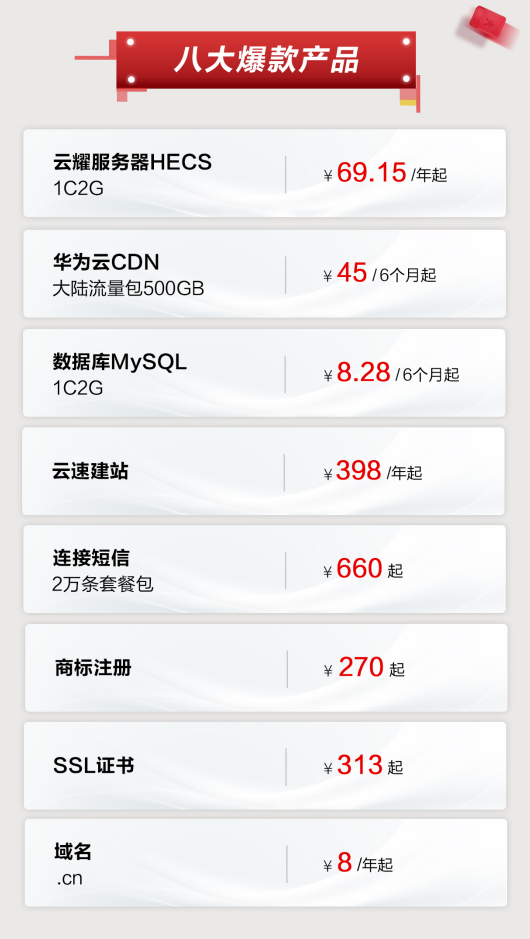 而华为云CDN大陆流量包500G,活动价45元/6个月,仅为原价的5折,在华为云加速黑科技的支持下,可以满足多种网站加速服务场景,正在为超过十亿华为手机用户提供全球加速服务;数据库MySQL 1C2G规格价格仅8.28元/6个月,相当于打了0.2折的超低折扣,一天不到5分钱,其高并发、高可靠、权威安全认证的特性,可以满足电商、移动游戏、电子政务、IoT等多个场景的需求。此外,云速建站、联接短信、商标注册、SSL证书、域名等多个产品在828企业上云节期间也均有重磅优惠。