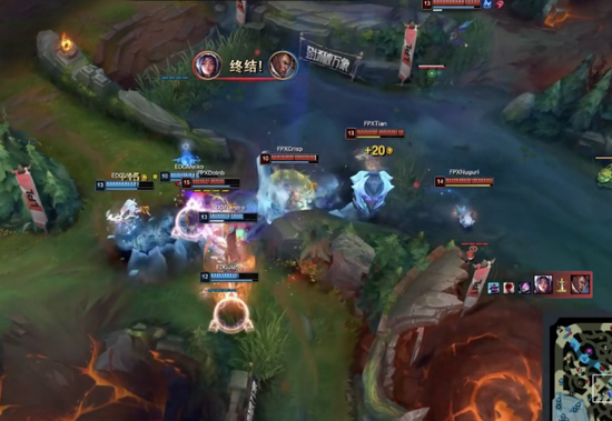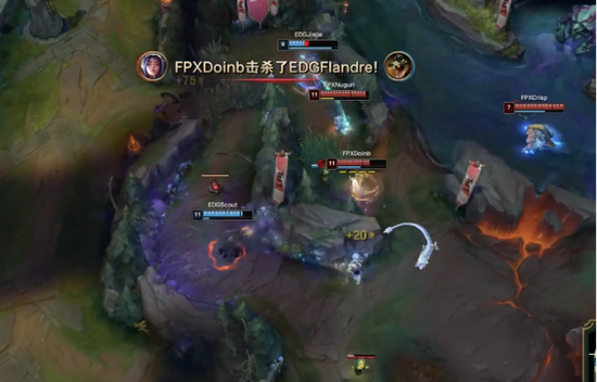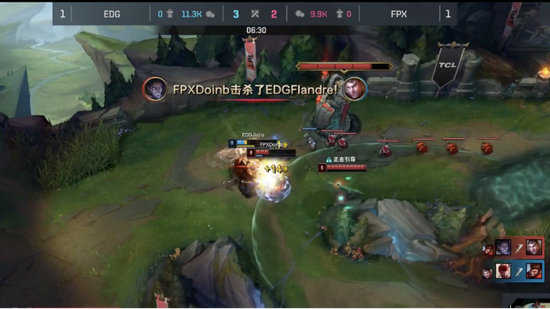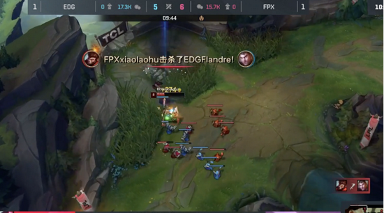 9分钟,双方中上野交锋,FPX成功击杀Jiejie,随后xiaolaohu在线上单杀圣枪哥。