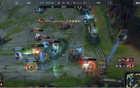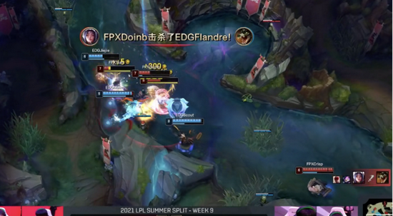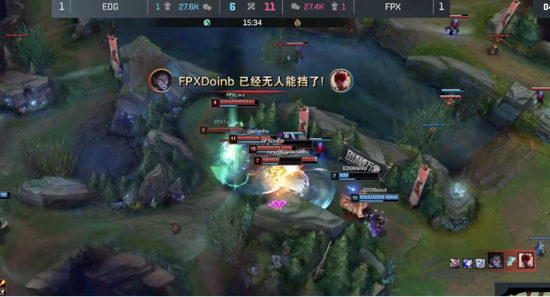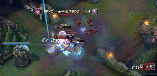 之后FPX拿下大龙仅损失一人,进一步扩大经济优势,EDG已无力抵挡FPX的冲阵体系,FPX下路直接果断越塔,Doinb和xiaolaohu各拿下两个人头,Doinb塞拉斯8-0达到超神!