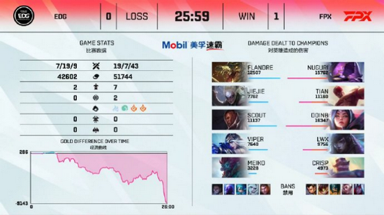 第二局比赛也是一边倒的比赛,Doinb选出了莉利娅中单,虽然Doinb在中路对面方面并没有陷入劣势,而且FPX也和第一局一样积极的游走做事,但是第二局EDG的交换资源做得更好,每次FPX想尝试做事之后,经济都会亏的更多,之后EDG也是趁势直接上高地,在27分钟快速结束掉了比赛!