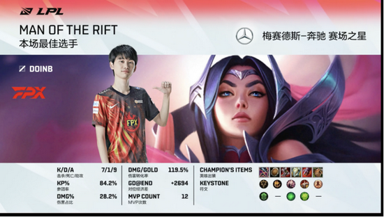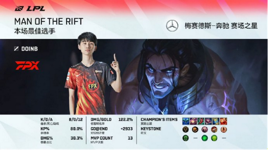 Doinb的肉装刀妹也让EDG苦不堪言,全场伤害最高,七杀能打能抗的FPX.Doinb的刀妹拿下了第一局的MVP!