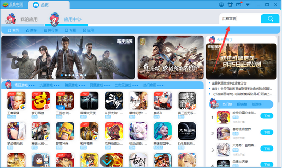 方法2:进入“应用中心”首页,通过推荐游戏,也可找到《洪荒文明》。